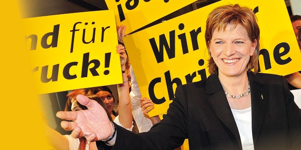 Konfetti-Regen. Die alte und neue Bürgermeisterin kam erst gegen 18.30 Uhr ins Rathaus und wurde von ihren Fans begeistert gefeiert: Blitzlichtgewitter und Fußballchöre à la „Christine Uh-Oooh“ begleiteten die Siegerin durch das Rathaus in den Plenarsaal. Konfetti-Fontänen und Partystimmung, der Abend war gelaufen.