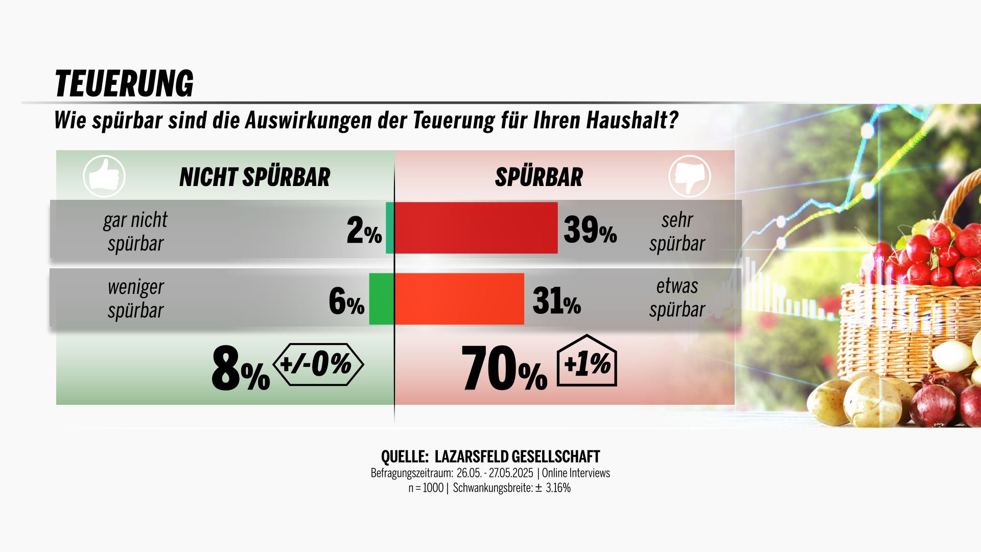 Wien. Auch drei Jahre nach dem russischen Einmarsch in der Ukraine, der ja die Preise hierzulande in die Höhe schnellen ließ, ist der Krieg noch im Gange und die Inflation weiter ein Thema. In der neuesten Umfrage der Lazarsfeld-Gesellschaft für oe24 (1.000 Befragte, 3,16 % Schwankungsbreite) geben immer noch 70 Prozent an, die Inflation etwa (31 %) oder sogar sehr (39 %) zu spüren. Das ist ein Anstieg von einem Prozentpunkt im Vergleich zur Vorwoche.