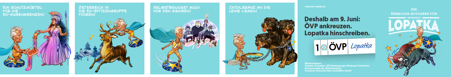 Die ÖVP ist in der aktuellen EU-Wahlumfrage für oe24 nur auf Platz 3. Ein Cartoon soll Spitzenkandidat Reinhold Lopatka jetzt auf Platz 2 hieven.