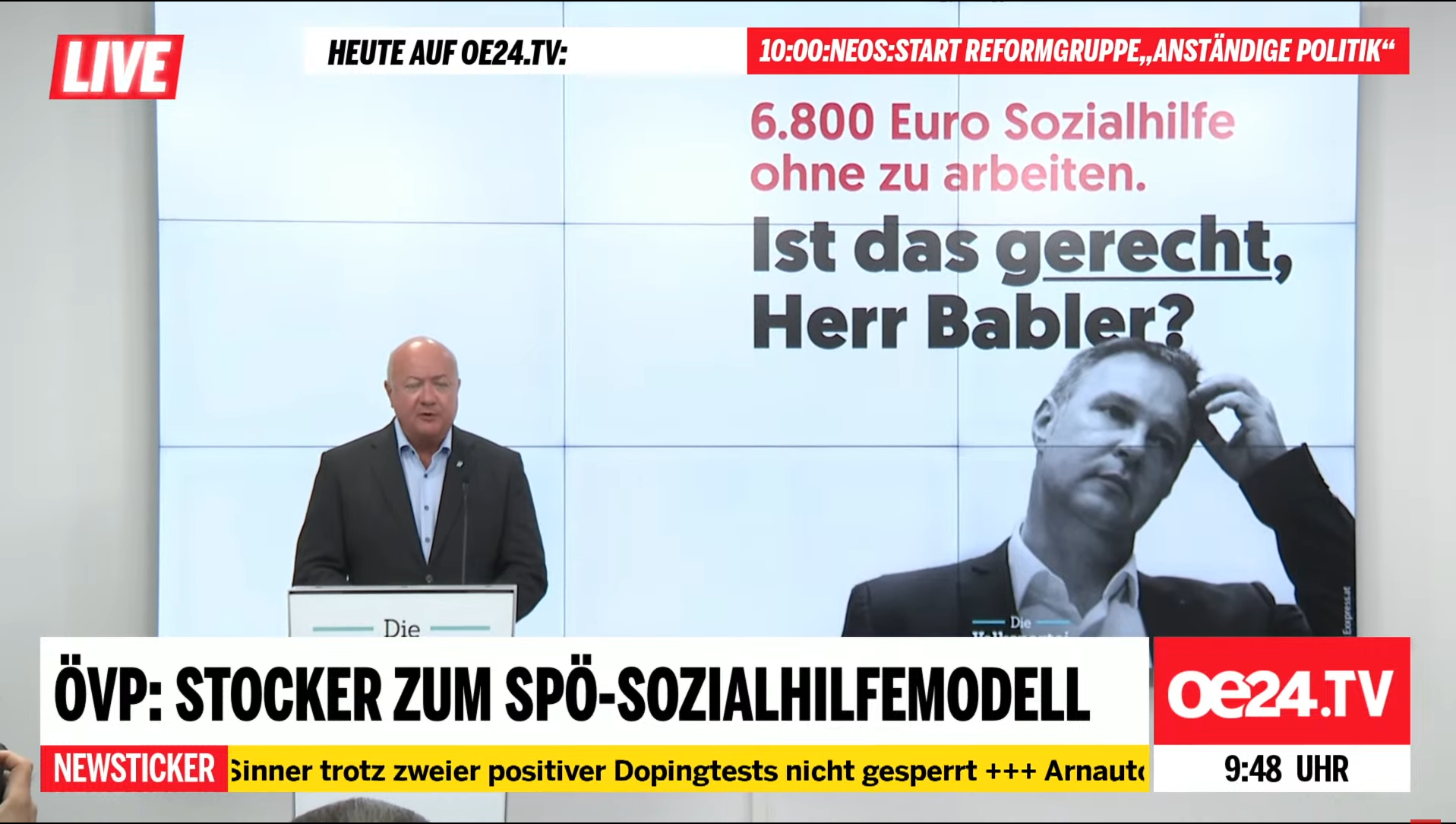 Das Sozialsystem sei für jene da, die nicht arbeiten können oder die dauerhaft auf Hilfe angewiesen seien, gab Stocker zu bedenken. Die SPÖ plane jedoch, das Modell aus Wien in ganz Österreich umzusetzen. Hier setzt die aktuelle Kampagne an, mit der man sich direkt an den SPÖ-Vorsitzenden wendet. "6.800 Euro Sozialhilfe ohne zu arbeiten. Ist das gerecht Herr Babler?", lautet ein Slogan. In einem anderen wird bekrittelt, dass die SPÖ Leistung nicht belohnen, sondern bestrafen wolle.