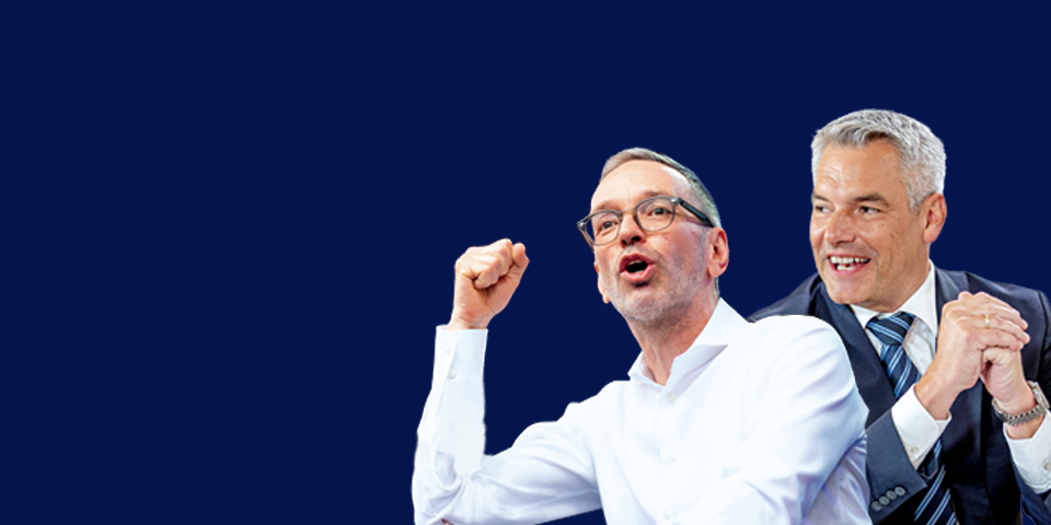 Türkis. Denn die ÖVP stagniert auf 24 % – der Abstand bleibt damit deutlich bei 3 Prozentpunkten. Zwar behält die Partei von Kanzler Karl Nehammer den 2. Platz, den sie seit der EU-Wahl am 9. Juni hat, der Nr. 1 ist sie aber nicht wirklich näher gerückt. Und auch in der Kanzlerfrage kann Nehammer zwar aufholen – FPÖ-Chef Herbert Kickl liegt aber auch hier vorn, und zwar gleich um 4 Punkte.