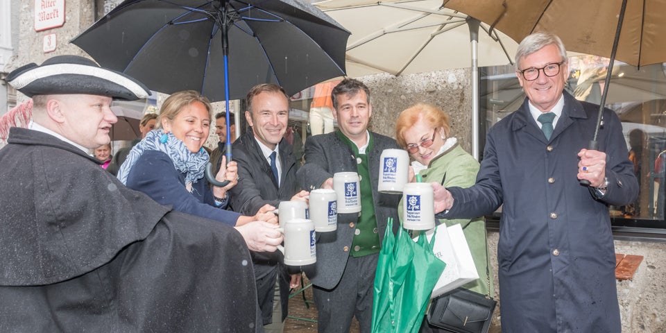 Die Bürgergarde feierte die Wiedereröffnung der Gastronomie mit Salutschüssen am Alten Markt. Bürgermeister Harald Preuner zapfte anschließend ein Bierfass an. Auf das anschließende Posieren für das Foto reagiert NEOS-Gemeinderat Rößlhuber entsetzt: "Seit Wochen predigt die Bundesregierung aber auch die Stadtregierung, dass immer ein Babyelefant Anstand zu anderen Menschen zu halten ist. Ihren Babyelefanten haben die drei aber offenbar im Schloss Mirabell vergessen, denn die Bilder zeigen eindeutig, dass niemand den Mindestanstand einhält."