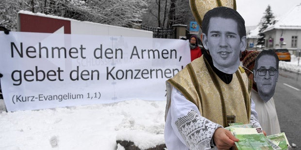 "Nehmet den Armen, gebet den Konzernen - Kurz-Evangelium 1,1". Die globalisierungskritische Organisation Attac hat sich anlässlich der Regierungsklausur in Mauerbach eine besondere Protestaktion einfallen lassen. Mit einer Maske von Kanzler Sebastian Kurz (ÖVP) und in Bischofs-Ornat haben Aktivisten riesige Geldscheine an Konzerne verteilt.
