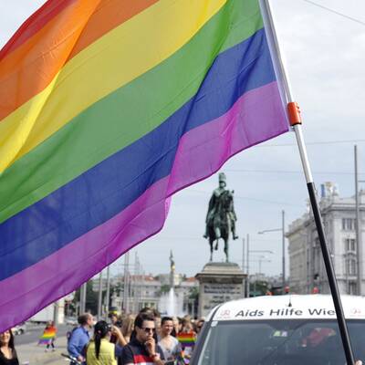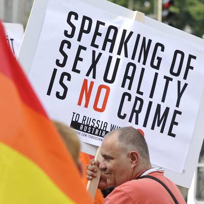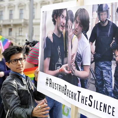 Während Putin in der Hofburg sein Presse-Statement abgibt, protestieren auf der Straße Aktivisten gegen die die homophobe Gesetzgebung und Menschenrechtsverletzungen in Russland im Rahmen des "Regenbogenmarschs".