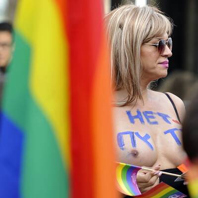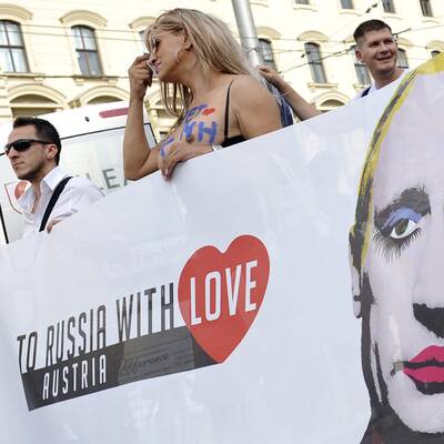 (c) APA/Punz; Eine Frau protestiert gegen Putin. Auf einem Plakat steht: "Liebe kennt kein Geschlecht"