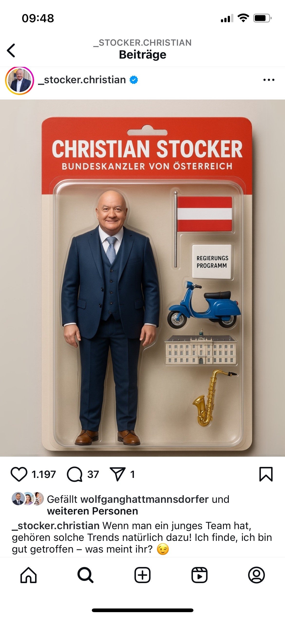 Kanzler Christian Stocker - als Plastikspielzeugfigur mit blauer Vespa, Österreichfahne und Saxophon.