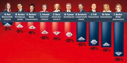 Am besten erfangen hat sich Unterrichtsministerin Claudia Schmied, die zwar 10 Punkte dazugewann, aber immer noch bei minus 10 Punkten hält. Ansonsten konnten ausgewiesene Fachminister punkten: Wirtschaftsminister Reinhold Mitterlehner – in der Tagespolitik äußerst zurückhaltend – führt das Ranking an, er legte 7 Punkte zu und liegt derzeit mit plus 15 an der Spitze. Auch Außenminister Michael Spindelegger erholte sich deutlich, Platz 2 mit 10 Zählern ist ihm sicher. Bester SPÖ-Minister bleibt Rudolf Hundstorfer. Dessen leutselige Art kommt an: plus 9 Punkte.