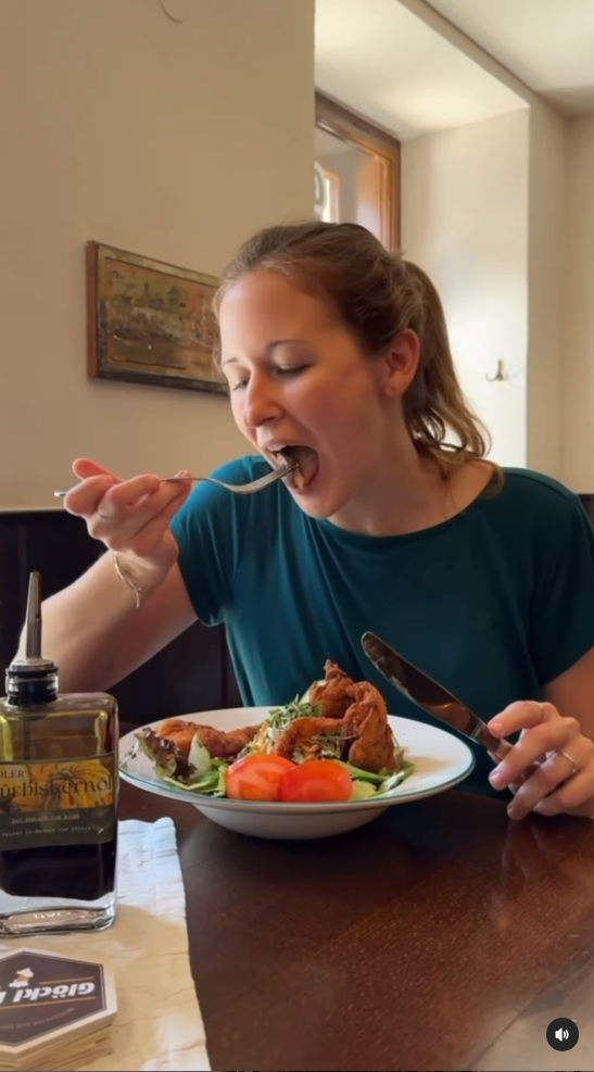 Dann biss Plakolm genießerisch in ein Backhendel, weil sie in der Steiermark sei, genieße sie dieses mit Salat und einer großen Portion Kernöl - Mahlzeit!