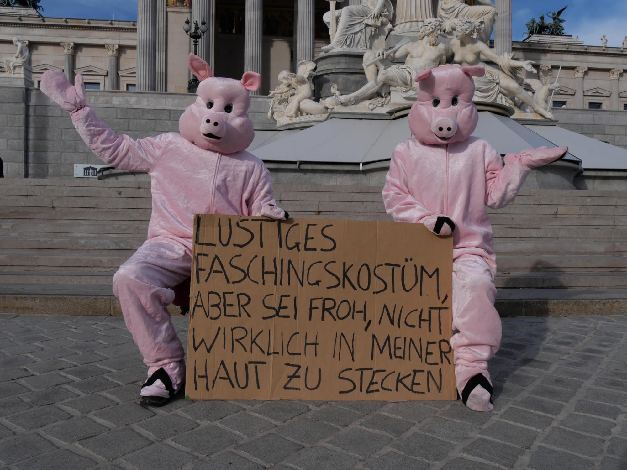 Daher erinnere man die Gesellschaft "aber insbesondere die ÖVP" daran, wie "sehr Schweine ohne Stroheinstreu" leiden. „Lustiges Faschingskostüm, aber sei froh, nicht wirklich in meiner Haut zu stecken“, grunzt eines der Schweinchen das Motto der Aktion, welches auch auf einem Schild prangt.