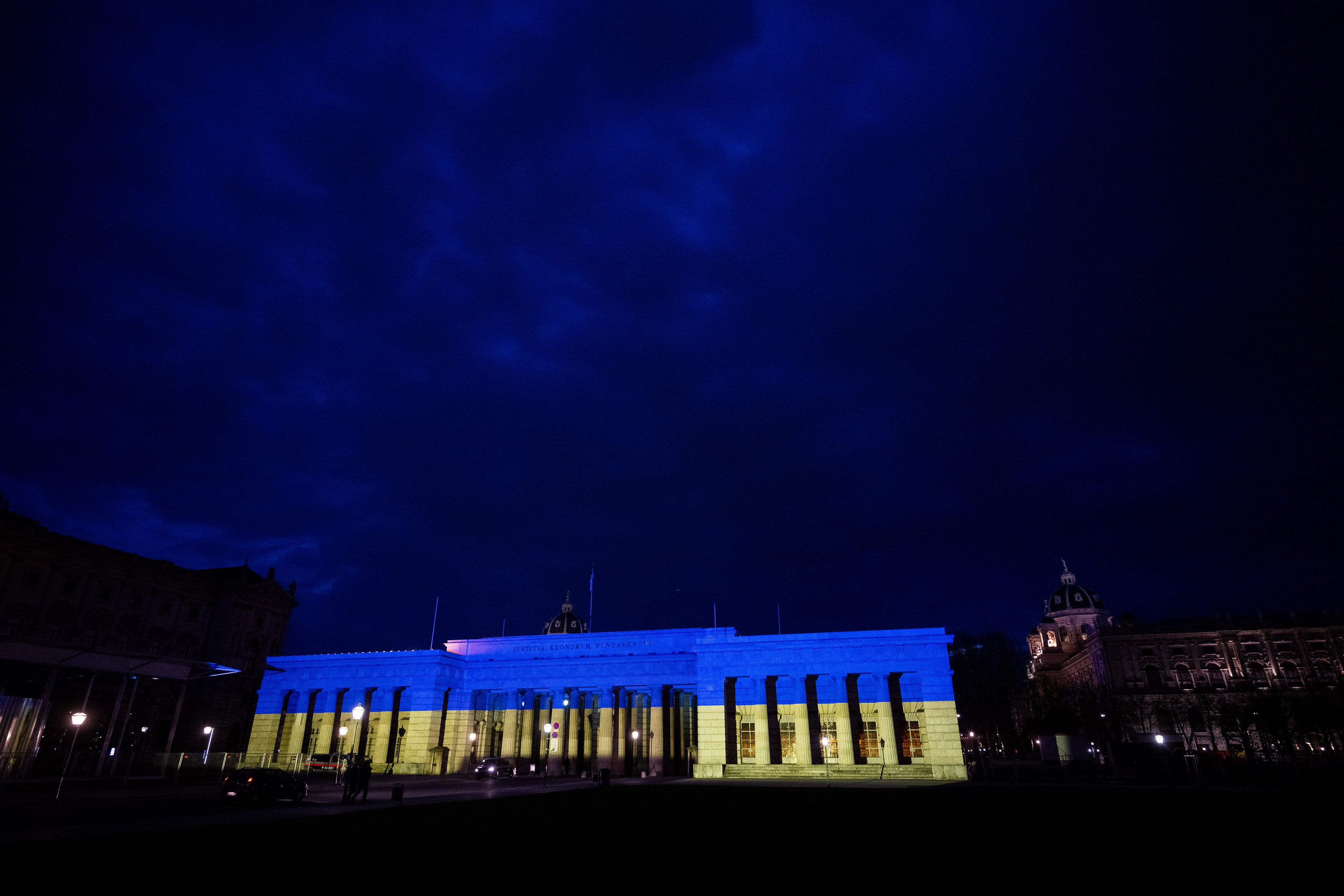 Als Zeichen der Solidarität mit der Ukraine wurde am Freitagabend das äußere Burgtor in den Farben der ukrainischen Nationalflagge Blau-Gelb beleuchtet. "Heute jährt sich der Beginn des Russischen Angriffskrieges auf die Ukraine. Die Folgen sind Zerstörung, Leid unzählige zivile Opfer und Millionen von Menschen, die ihre Heimat verlassen mussten", erklärte Bundeskanzler Karl Nehammer (ÖVP).