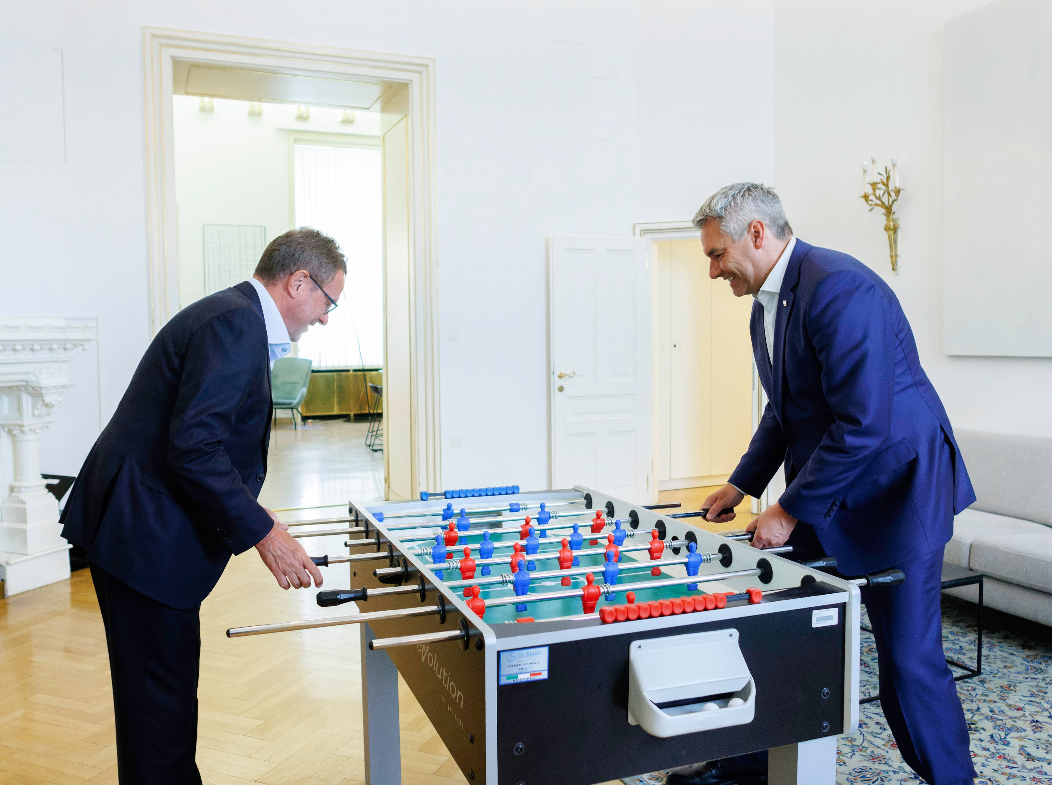 Nachdem der Bundeskanzler den Teamchef durch das geschichtsträchtige Gebäude geführt hat, durfte ein Match am „Wuzler“ nicht fehlen. Das respektable Ergebnis nach der zweiten Hälfte: 1:1.