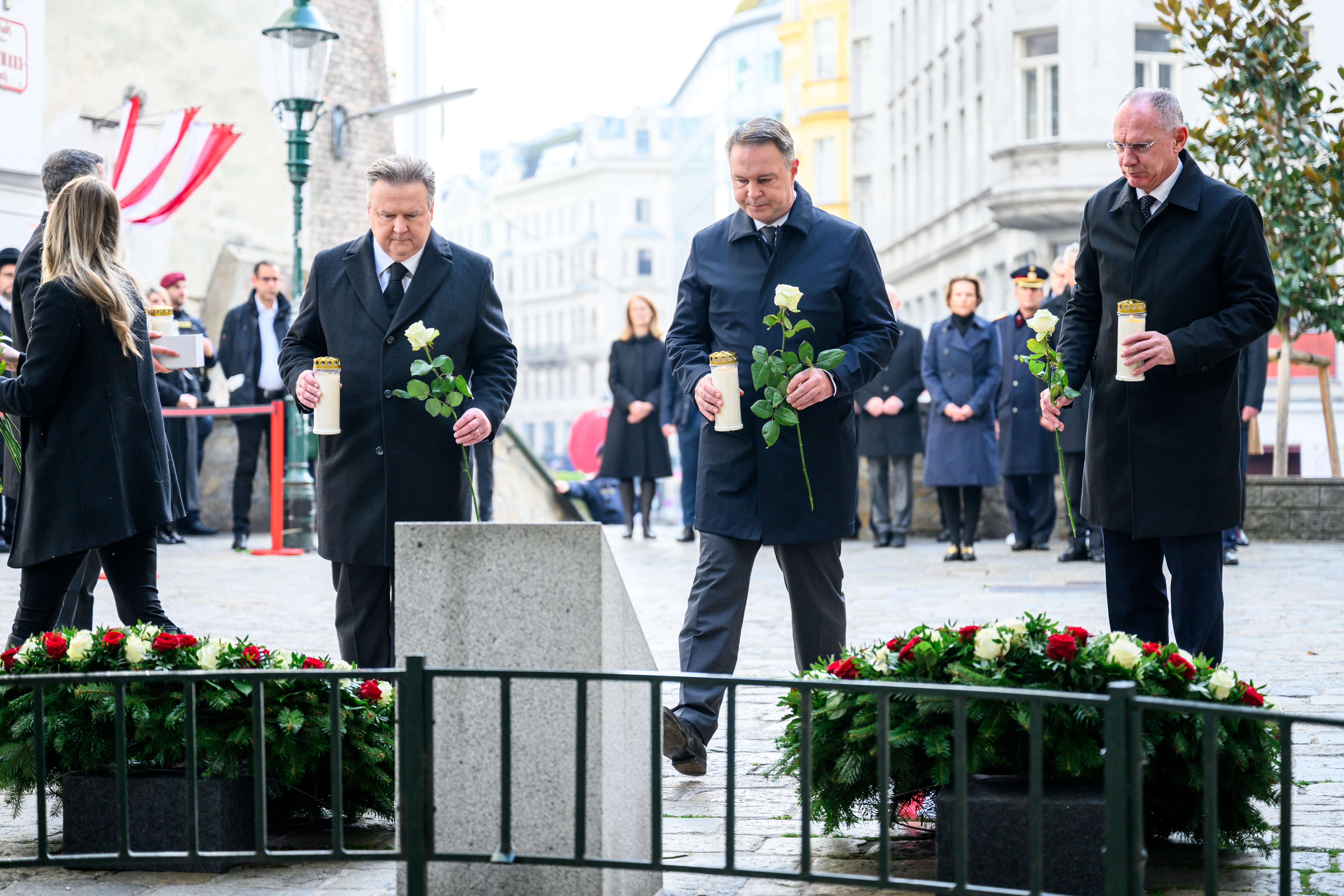Kranzniederlegung in der Innenstadt mit Babler, Karner und Nehammer