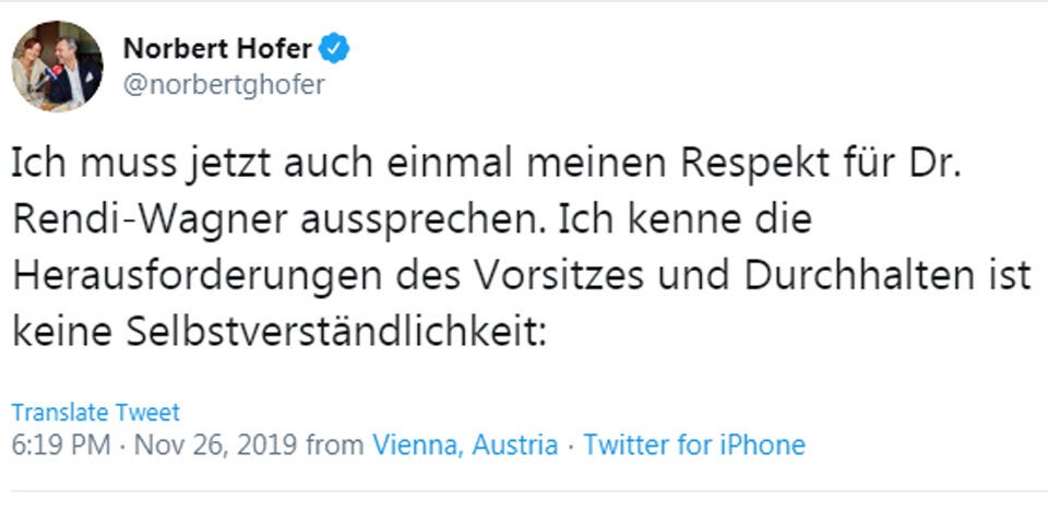 "Ich muss jetzt auch einmal meinen Respekt für Dr. Rendi-Wagner aussprechen. Ich kenne die Herausforderungen des Vorsitzes und Durchhalten ist keine Selbstverständlichkeit", schreibt Hofer.
