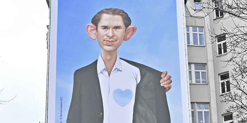 Bundeskanzler Sebastian Kurz (ÖVP), dem unter seinem Sakko das Herz fehlt: Diese Karikatur prangt seit Dienstag auf einer 230 Quadratmeter großen Feuermauer an der Linken Wienzeile in Wien. Das Bild stammt vom Karikaturisten Gerhard Haderer, der es der Initiative "Courage" unentgeltlich zur Verfügung gestellt hat.