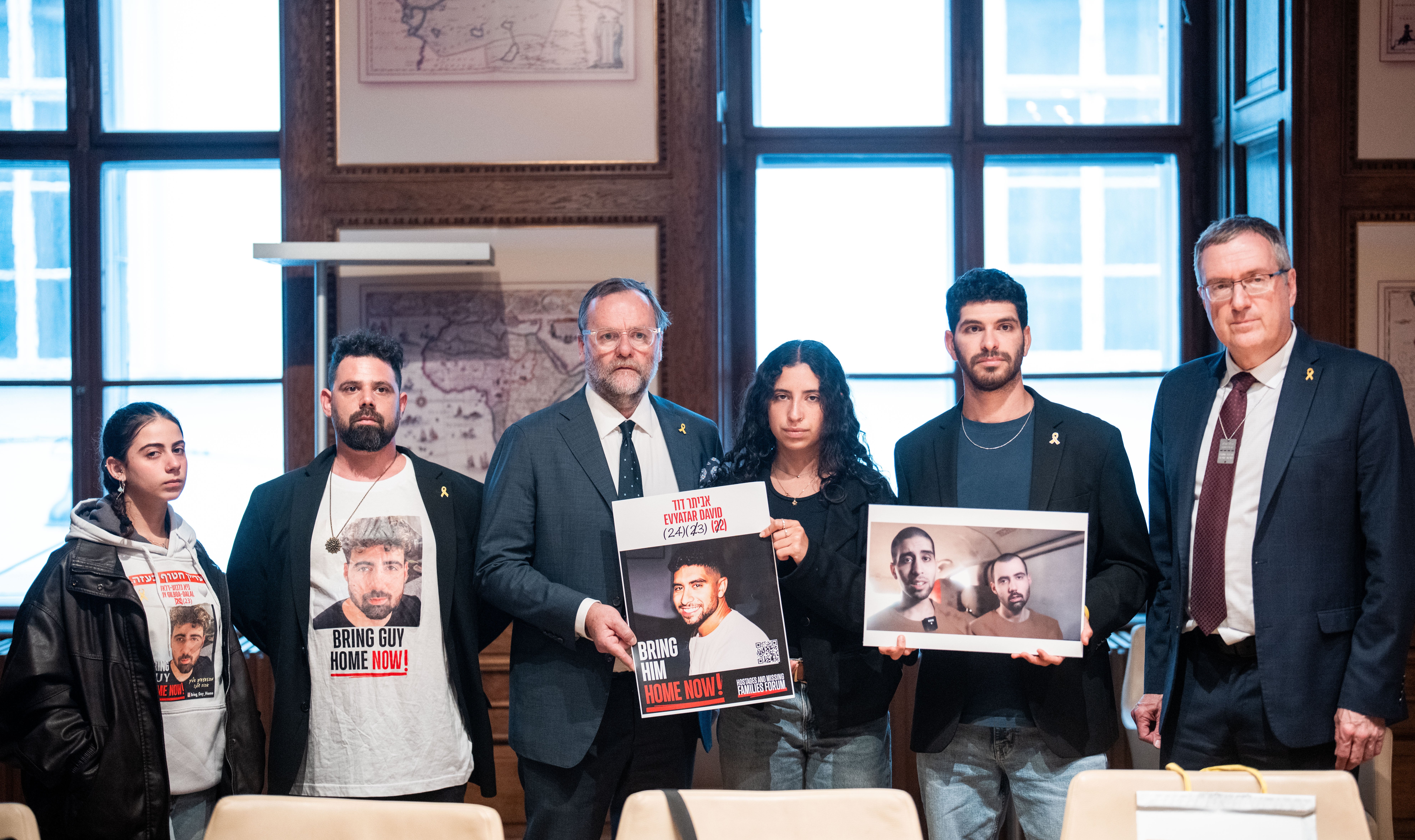 Im Beisein von Schellhorn und des israelischen Botschafters David Roet hielten die vier Geschwister - es handelte sich jeweils um einen Bruder und eine Schwester der beiden Geiseln - Tafeln mit Bildern von Evyatar David und Guy Gilboa-Dalal in die Kameras der anwesenden Fotografen. Auf beigefügten Texten forderten sie zur Freilassung ihrer Geschwister aus der Hamas-Geiselhaft auf.