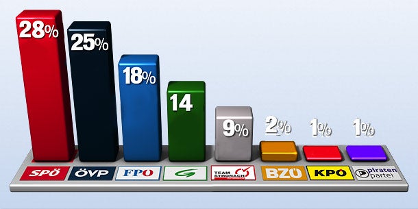 Die FPÖ bleibt mit 18 % weiter unter der 20-Prozent-Marke, die Grünen stagnieren (vorerst) bei 14 % und auch Stronach kann sich mit seinen 9 % nicht verbessern.