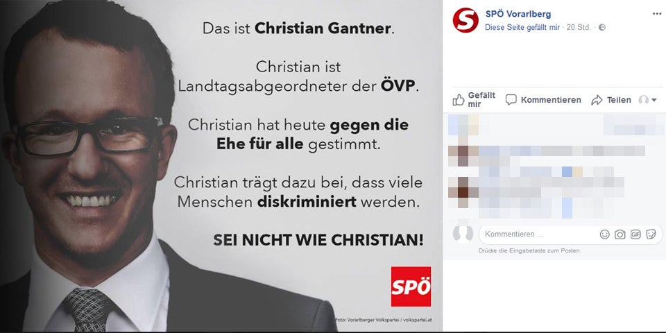 Darin beschuldigen sie einzelne ÖVP-Mandatare, die gegen die „Ehe für alle“ stimmten der Diskriminierung. „Christian ist Landtagsabgeordneter der ÖVP. Christian hat heute gegen die Ehe für alle gestimmt. Christian trägt dazu bei, dass viele Menschen diskriminiert werden. SEI NICHT WIE CHRISTIAN!“, heißt es beispielsweise auf einem Bild, das Christian Gantner von der ÖVP zeigt.