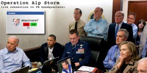 Mit den Worten "Jetzt ist es offiziell... Grüße an das FBI :-)))" schickt er seinen Fans eine Fotomontage. Aufgenommen wurde das Foto bei der Jagd der USA auf Terrorfürst Osama Bin Laden. US-Präsident Barack Obama und die damalige Außenministerin Hillary Clinton verfolgen das Geschehen gespannt. Allerdings wird diesmal nicht Bin Laden, sondern HC Strache gejagt - mit der Unterstützung von Bundeskanzler Werner Faymann im Hintergrund des Fotos. Mehr als 1.400 Likes hat Strache für das Foto bereits bekommen.