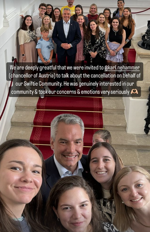 Die Community postete im Anschluss an das Treffen ein Foto auf Instagram mit folgendem Wortlaut: "Wir sind sehr dankbar, dass wir zu @karl.nehammer (Bundeskanzler von Österreich) eingeladen wurden, um im Namen unserer Swiftie Community über die Absage zu sprechen. Er war wirklich an unserer Gemeinschaft interessiert und hat unsere Sorgen und Emotionen sehr ernst genommen."