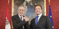- 14 Uhr: Hofburg. Schwarzenegger – er war schon am Wochenende in Kitzbühel – legt den langen Weg in die Büroräume des Bundespräsidenten lachend zurück.