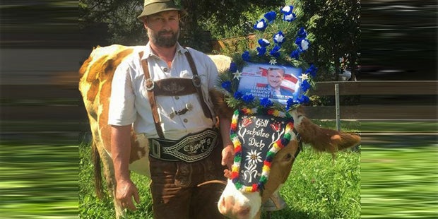Ein Wahlträger der etwas anderen Art sorgt beim Tiroler Bauernbund für Entrüstung: Der freiheitliche Götzner Gemeinderat und Bauer Christian Abentung trieb nämlich beim traditionellen Almabtrieb sein Rindvieh geschmückt mit dem Konterfei des BP-Kandidaten Norbert Hofer ins Tal. Das gefiel einigen Bauernbund-Funktionären jedoch gar nicht, berichtete die "Tiroler Tageszeitung" (Donnerstagsausgabe).