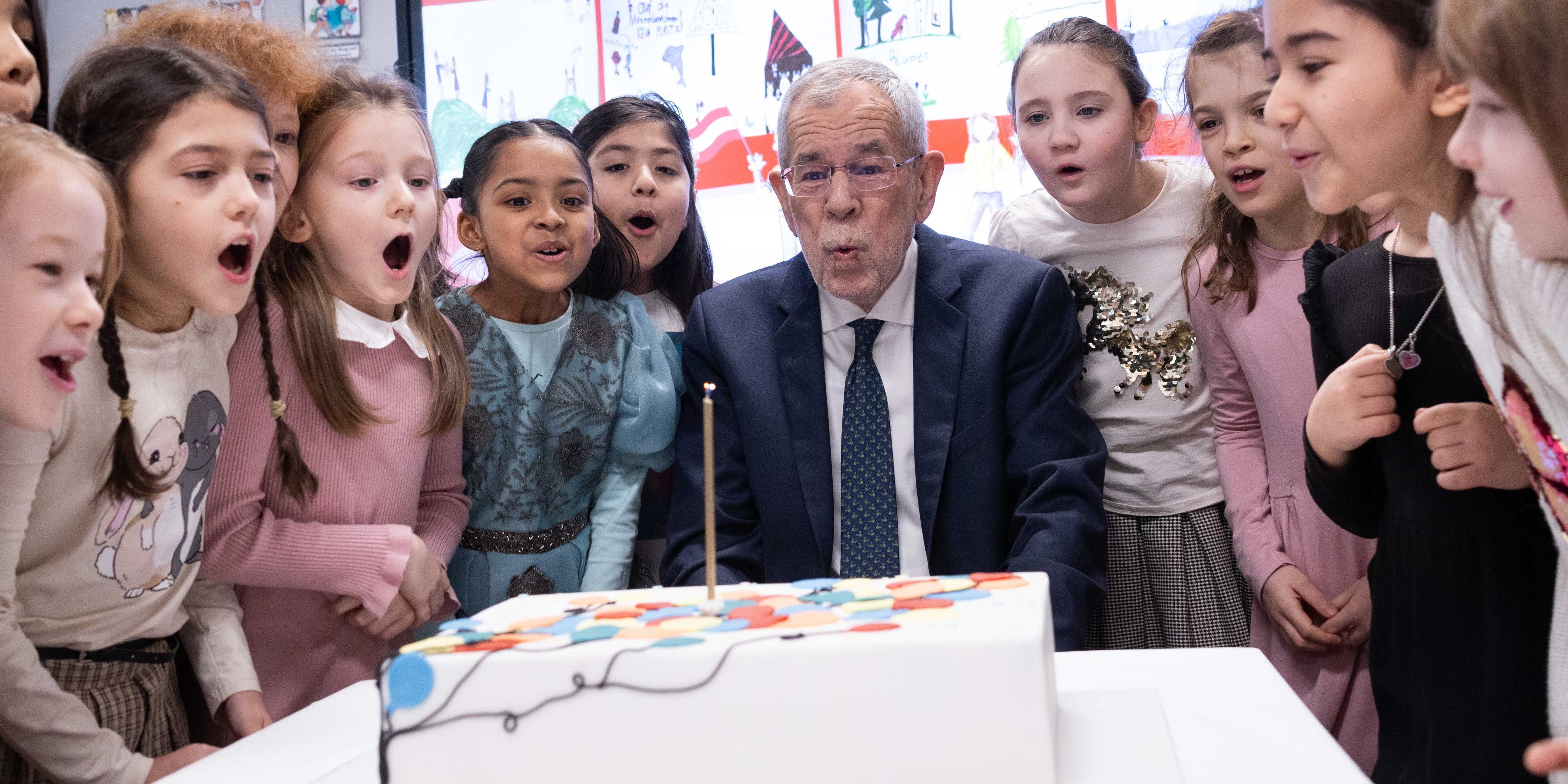 Vorgefeiert. VdB hat schon gestern mit Zweitklässlern im Bildungscampus Liselotte Hansen-Schmidt in Wien seinen Geburtstag vor-gefeiert. Die Klasse hat sich in einer Projektarbeit mit dem Amt des Bundespräsident beschäftigt. VdB hat die Schülerinnen und Schüler dann mit einer Torte überrascht.