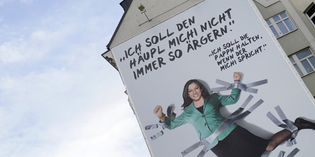 Sie lacht - obwohl sie mittels Klebeband fixiert wurde. Seit Dienstag prangt ein Riesenplakat an der Wiener Westeinfahrt unmittelbar beim Naschmarkt, auf dem die Wiener Vizebürgermeisterin und Grüne Spitzenkandidatin Maria Vassilakou in ungewohnter Pose zu sehen ist. Dank der Größe des Bildes gehen sich darauf sogar drei Slogans aus.
