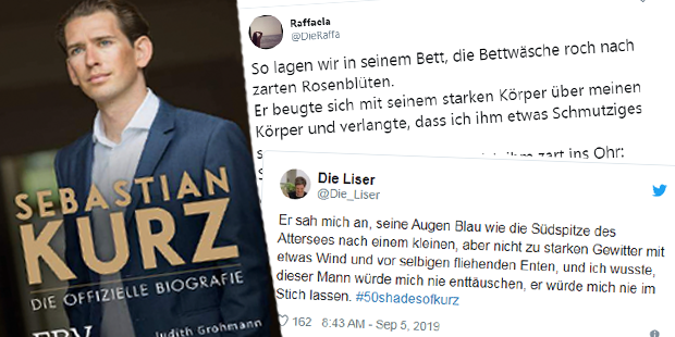 Verfasst wurde sie von der Journalistin Judith Grohmann. Obwohl das Buch (Sebastian Kurz. Die offizielle Biografie) noch nicht auf dem Markt ist, wird es auf Twitter schon verrissen. Unter dem Hashtag #50shadesofKurz haben Dutzende Witzbolde Persiflagen à la 50 Shades Of Grey verfasst. Die Protagonisten: klarerweise Kurz und die Autorin. So kommt die „Balkan-Rute“ ebenso zum Einsatz wie schmutziges Vokabular wie „Erbschaftssteuer“ …