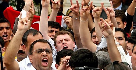 Zwei Finger als Ohren abgespreizt und die anderen drei zur Schnauze geformt - so sieht der türkische Wolfsgruß aus. Einige der Aggressoren von Mittwoch und Donnerstag zeigten ihn, er ist das mittlerweile in Österreich verbotene Erkennungszeichen der "Grauen Wölfe". Das Wolfssymbol geht auf eine Legende in der türkischen Mythologie zurück. Demnach führte eine Wölfin ein Turkvolk im frühen Mittelalter aus dem sagenumwobenen Tal Ergenekon.
