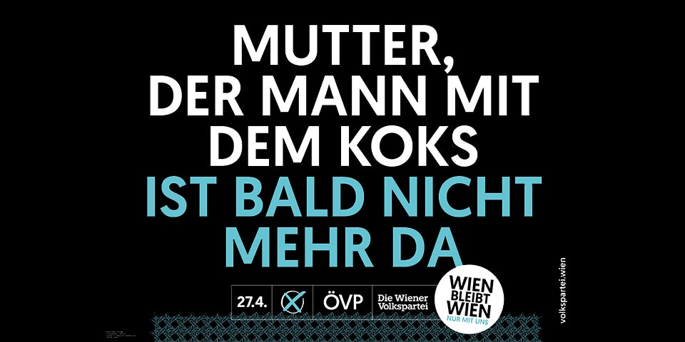 "'Mutter, der Mann mit dem Koks ist bald nicht mehr da'! Das hoffen wir auch! Nämlich, dass sich die Wiener Volkspartei nicht weiter in Anlehnung an Falco Texten vergreift und diese Parteiwerbung aus dem Verkehr zieht! Die Falco Privatstiftung verwehrt sich gegen jegliche politische Vereinnahmung der Person Falco (Hans Hölzel) oder seiner Werke. Wir haben die Angelegenheit unseren Juristen übergeben."