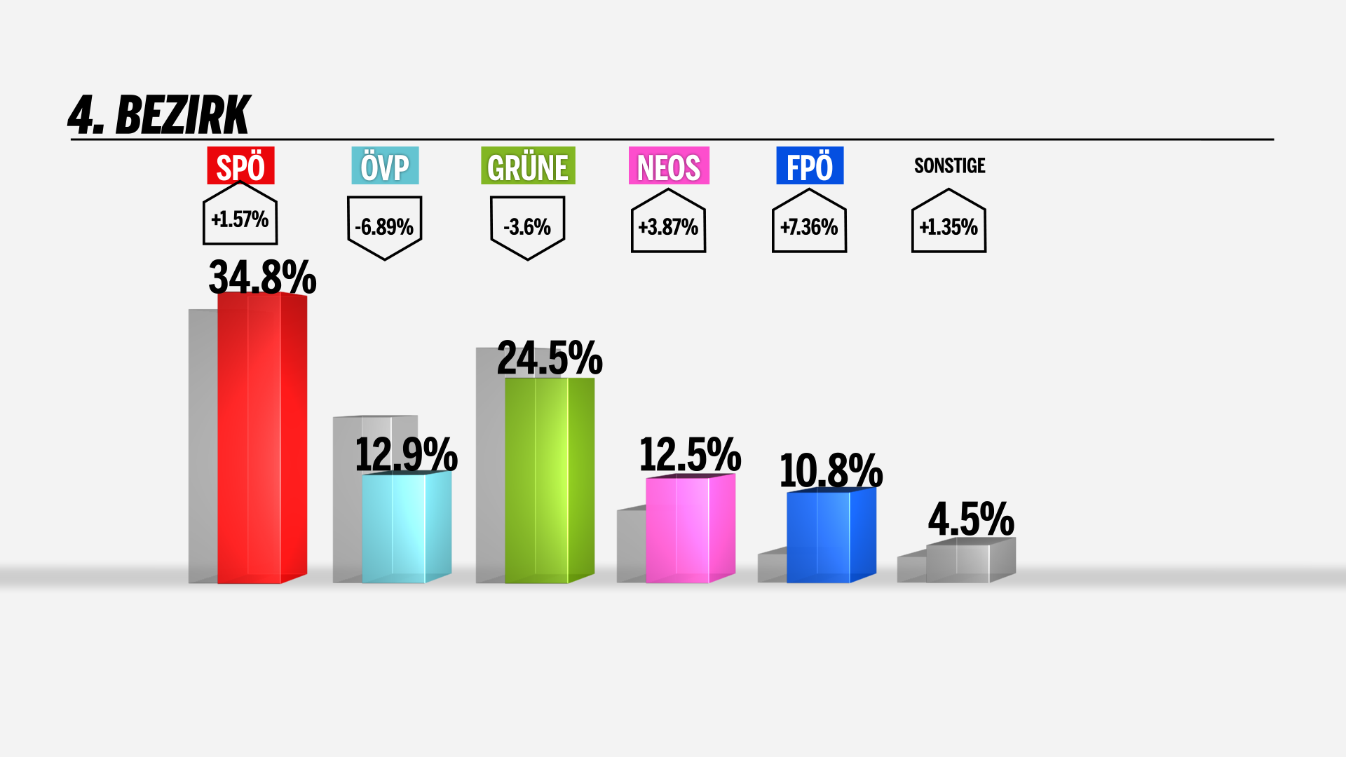 Bezirsksvorsteherin Lea Halbwidl (SPÖ) konnte im 4. Bezirk sogar zulegen, landete bei über 34 Prozent. Für viel Ärger sorgte im Bezirk der Umbau der Argentinierstraße zum „Highway“ für Radler.Speziell die ÖVP, die bisher den dritten Platz mit 19,8 Prozent belegte, bekrittelte den Umbau. Sie verlor stark, liegt im Bezirk jetzt bei 12,9%. Ebenso wie die FPÖ, die immerhin auf über 10 Prozent zulegen konnte. Auf Platz 2 im 4. Bezirk liegen die Grünen mit 24,5 Prozent. Die NEOS kamen auf 12,5%.