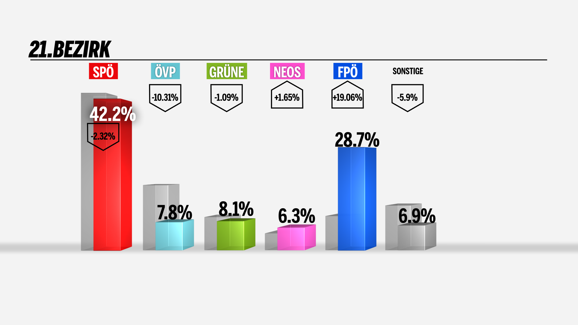 Bei der Gemeinderatswahl hat die SPÖ die FPÖ in Floridsdorf auf den 2. Platz verwiesen. Die Roten heimsten 42,2 Prozent der Stimmen ein, während die Blauen bei 28,7 Prozent zu liegen kamen. Dahinter folgen ÖVP (7,8 %), Grüne (8,1 %) und Neos (6,3%).Seit 1945 stellt die SPÖ im Heimatbezirk von Bürgermeister Michael Ludwig den Bezirksvorsteher, derzeit ist das Georg Papai, der mit 29 Mandaten die Bezirksversammlung dominiert. Die FPÖ lag allerdings nach der vergangenen Nationalratswahl in Floridsdorf als einzigem Bezirk Wiens knapp vor der SPÖ. Papai musste sich also im Wahlkampf voll ins Zeug legen, um die Position der SPÖ zu halten. Themen um Wähler zu mobilisieren waren unter anderem das Alkoholverbot am Franz Jonas Platz, die Verhinderung der Seilbahn auf den Kahlenberg und mehr Polizisten. Die Freiheitlichen halten im Bezirksparlament derzeit 6 Mandate – ein starker Zuwachs mit den hier schlagenden Themen Migration und Sicherheit war für sie zu erwarten.