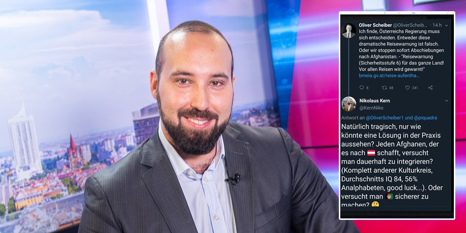 "Natürlich tragisch, nur wie könnte eine Lösung in der Praxis aussehen? Jeden Afghanen, der es nach Österreich schafft, versucht man dauerhaft zu integrieren? (Komplett anderer Kulturkreis, Durchschnitts IQ 84, 56% Analphabeten, good luck...). Oder versucht man Afghanistan sicherer zu machen?", lautete die Antwort von Niko Kern auf den Tweet von Oliver Schreiber.