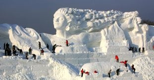 Bei der 20. Internationalen Schneeskulpturenausstellung in China begeistern 35 Meter hohe und bis 200 Meter breite Statuen das Publikum.