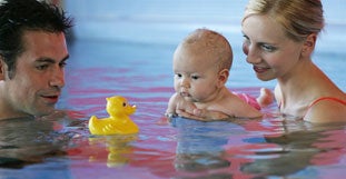 Schwimmen und Massagen: Die Bewegung in wohlig warmen Thermalwasser tut Babys besonders gut.