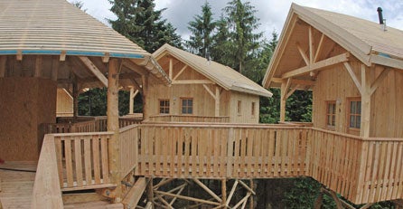 Die sechs Baumhäuser sind komplett aus Holz, was