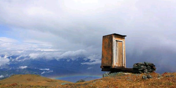 In 2.600 Metern Höhe steht die Toilette im Altai Gebirge auf einem Holzbrett über dem Abgrund. Als Gegengewicht dienen nur ein paar Steine. Dennoch scheint das stille Örtchen mit der wahnsinnigen Aussicht sehr stabil zu sein, denn es steht bereits seit 1939 dort.