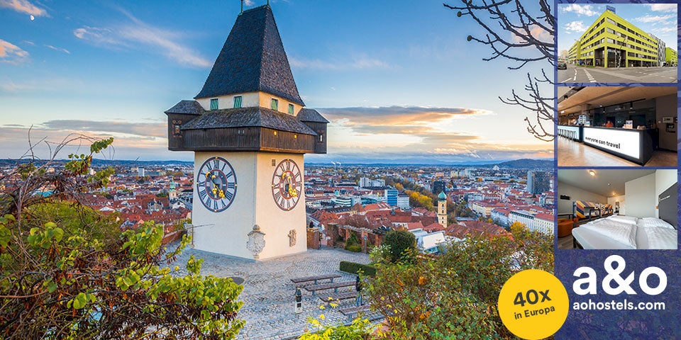 Um 15 Uhr kommen wir in Graz an und parken direkt am a&o Hotel. Wir haben uns ein Doppelzimmer gebucht und nur 30 Euro für die Nacht gezahlt, ein absolutes Schnäppchen!
