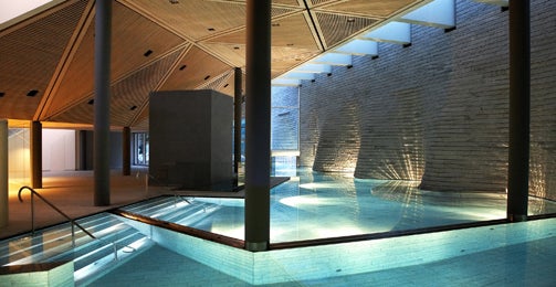 Die segelförmigen Lichthöfe des Spas ragen futuristisch in die Landschaft. Der Bau schmiegt sich ins Bergmassiv der Schweizer Alpen. Star-Architekt Mario Botta legte Hand an, um dieses exklusive Projekt zu verwirklichen. Um Platz für die riesige Wellness-Oase zu schaffen, wurden Hohlräume in den Fels gebrochen.