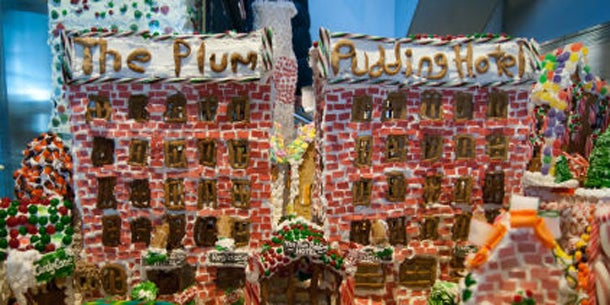 Mehr als 160 mindestens 15 Zentimeter hohe Häuser hat der 37-Jährige auf einem Gestell aus Holz versammelt und in einem Wissenschaftsmuseum für Kinder im New Yorker Stadtteil Queens aufgebaut. "Das größte Haus ist das "Plumpudding Hotel"", so Lovitch. Gemeint ist ein mit roten und grünen Schokolinsen verziertes Lebkuchengebäude mitten im Dorf.