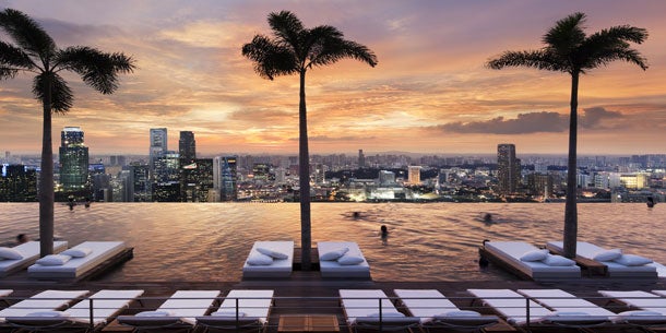 Mit seinen drei durch eine Dachplattform verbundenen Türmen ziert das Hotel Marina Bay Sands die gleichnamige Bucht von Singapur. Auf dem Deck in 200 Metern Höhe erstreckt sich der Infinity-Outdoorpool über 150 Meter Länge. Während die Hotelgäste hier ihre Bahnen ziehen, genießen sie den beeindruckenden Rundumblick über Singapur und im Anschluss das ausgiebige Schokoladen-All-You-Can-Eat-Buffet. Die Zimmer des Hotels sind in Erdtönen gehalten mit auffällig gemustertem Teppich und eleganten Möbeln in Beige. Zur Unterhaltung bietet das Fünf-Sterne-Haus seinen Gästen verschiedene Restaurants, Shops und ein Kasino sowie ein Museum und ein Theater mit wechselnden Ausstellungen und Shows.