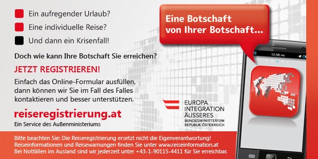 Um österreichische Reisende zum Beispiel über Naturkatastrophen oder politische Unruhen in ihrem Reiseland schnellstmöglich informieren und sie unterstützen zu können, bietet das Außenministerium die Möglichkeit einer „Online-Reiseregistrierung“. Eine Registrierung ist für jede Auslandsreise möglich, nur wenn Sie registriert sind, kann das Außenministerium Sie im Anlassfall informieren und unterstützen. www.reiseregistrierung.at