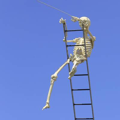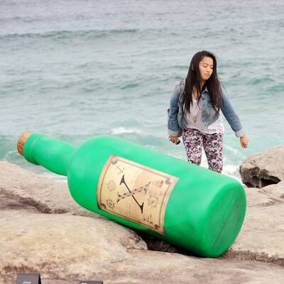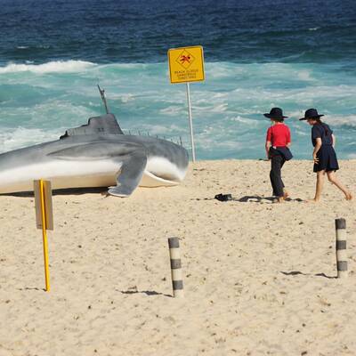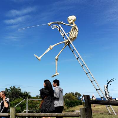 Der australische Künstler Ken Unsworth lässt ein menschliches Skelett aus Stahl und Fiberglas auf einer Leiter sitzend aufs Meer schauen. Irgendwo liegt ein Wal im Sand, der von Liliputanern attackiert wird. Klicken Sie sich durch die Bilder.