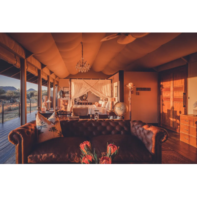 Luxuriöse Gästesuiten. Die Gmundner Lodge verfügt über zwölf luxuriöse Gästesuiten, darunter acht Einzelsuiten für zwei Personen und vier Familiensuiten, die zwei Schlafzimmer umfassen. Die Gästesuiten der Gmundner Lodge erinnern mit ihren weichen Ledersesseln, Mahagoni-Möbeln, Antiquitäten und Artefakten an den Glanz der alten Safari-Welt.