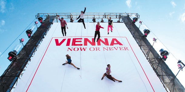 London. Wien fragte: „Shall we dance?“ Und bot ein Tänzchen der ganz schrägen Art. Acht Tanz-Artisten rührten zwei Tage lang im Zentrum von London die Werbetrommel für Wien – und zwar so: Auf einer 21 Meter hohen und 10 Meter breiten Wand am Trafalgar Square performten die an Seilen gesicherten Akrobaten Szenen, die typisch für Wien sind.