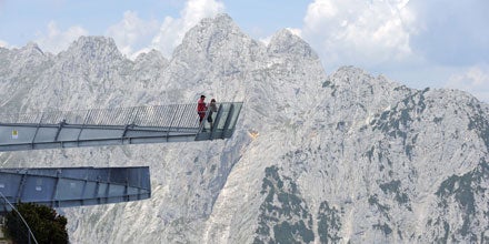 Die neue Aussichtsplattform "AlpspiX" auf der Alpspitze in den bayerischen Alpen ist nichts für Angsthasen. Bei schönem Wetter genießt man hier ein atemberaubenden Blick in die Bergwelt und vor allem auf die Zugspitze (2.962 Meter).