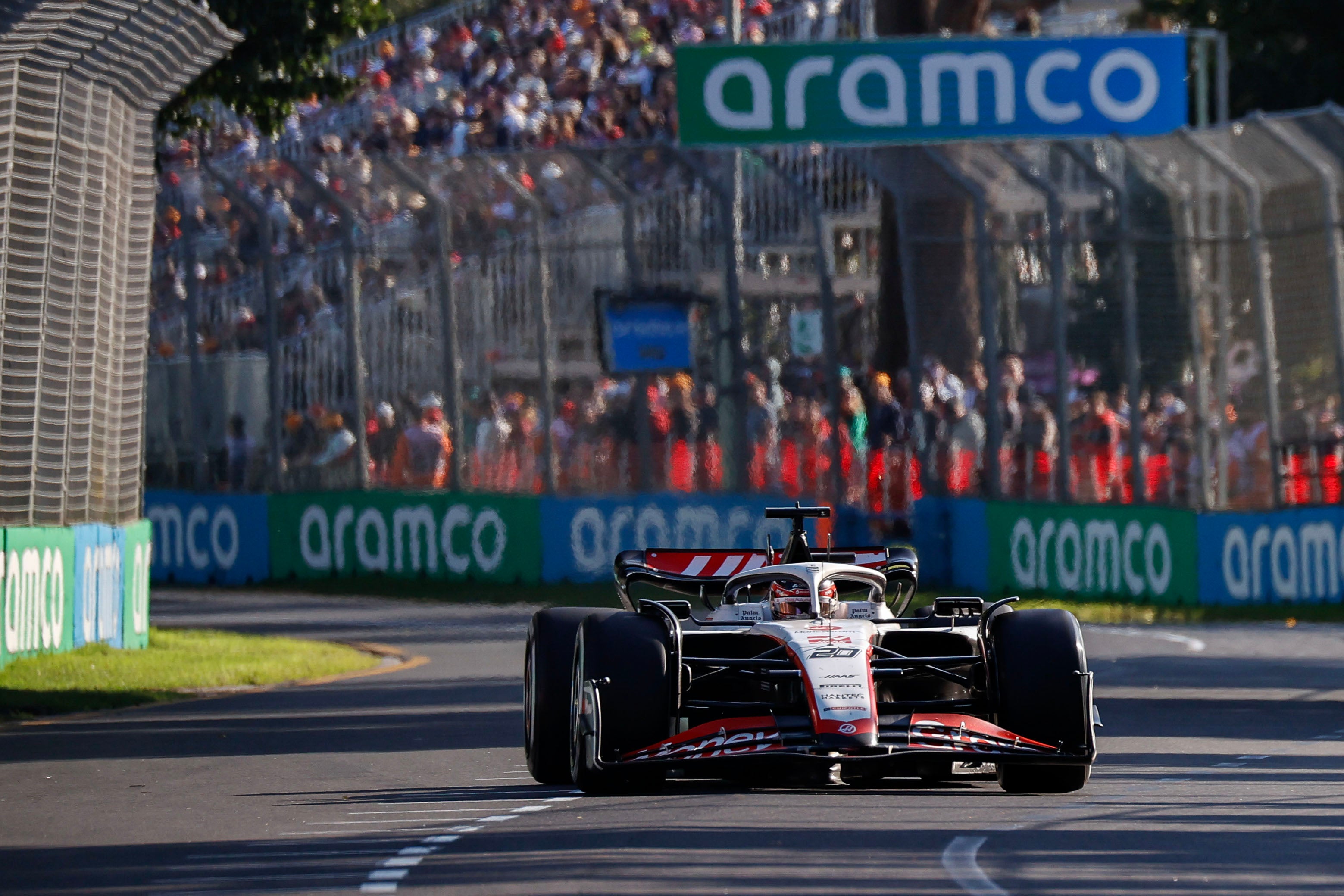 Beim Großen Preis von Australien crasht unter anderem Haas-Pilot Kevin Magnussen. Ein herumfliegendes Teil fliegt dabei über den Zaun und auf die Ränge - direkt auf einen Zuseher.