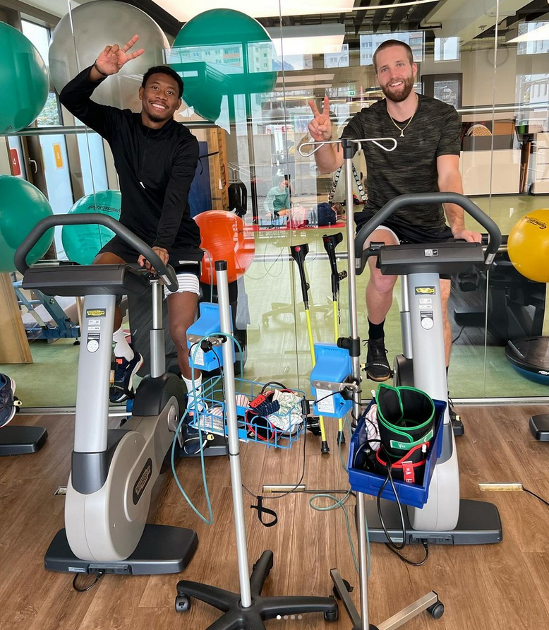 Fotos, die die heimischen Sportfans jubeln lassen sollten! Wir sehen David Alaba, wie er neben Marco Schwarz in die Ergometer-Pedale tritt. Der kurz vor Weihnachten von Kniespezialist Christian Fink am Kreuzband operierte Real-Madrid-Star lacht dabei und zeigt das "Victory"-Zeichen. Der vom selben Arzt zehn Tage später an derselben Stelle versorgte Skirennläufer radelt lächelnd.