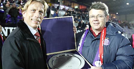 Im Zug des Testspiels wurde Daum von Austria-Präsident Katzian auch der Ehren-Teller überreicht (siehe Bild).