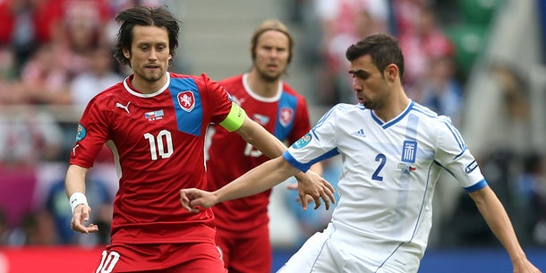 Gelbe Karten: Torosidis, K. Papadopoulos, Salpingidis bzw. Rosicky, Jiracek, Kolar